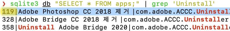 ( 캡처된 아래의 예시에서는 sqlite3 db "SELECT * FROM apps;" | grep 'Uninstall'로 했습니다. )